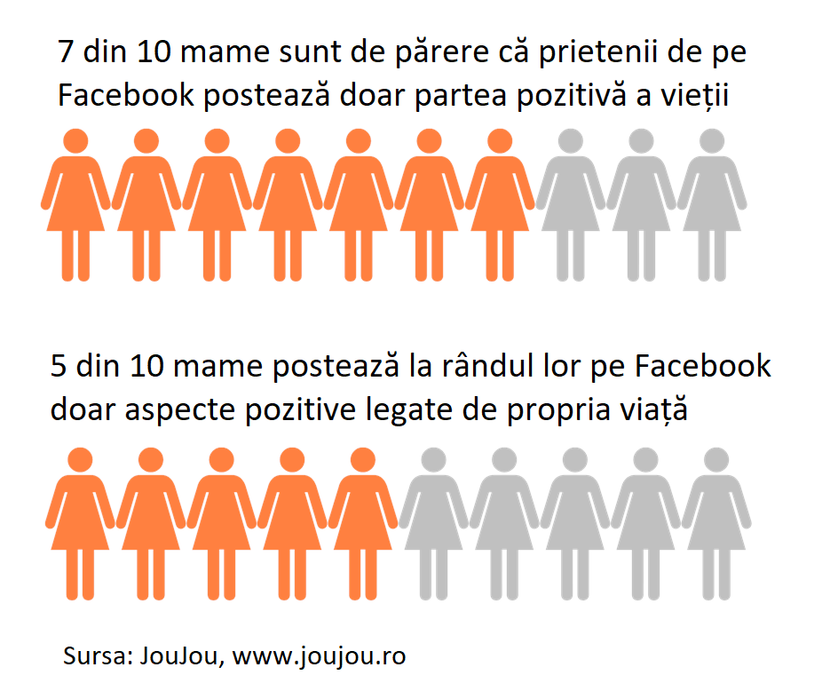 Aproape 7 din 10 mame sunt de părere că prietenii de pe Facebook postează doar partea pozitivă a vieții lor. Totodată, jumătate din mame postează la rândul lor pe Facebook doar aspecte pozitive legate de propria viață.