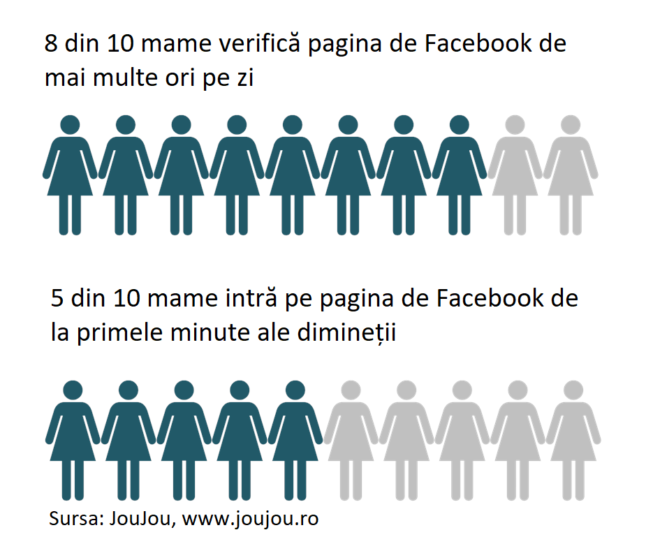 Pare foarte mult, însă cu siguranță această medie nu este departe de adevăr. Și spunem asta în condițiile în care și alte studii au relevat o medie de peste o oră pe zi de utilizare a Facebook-ului. Însă segmentul nostru – cel al mamelor, în rândul cărora o mare parte din ele se află în concediu de creștere a copilului – este ceva mai predispus la a petrece timp pe Facebook.