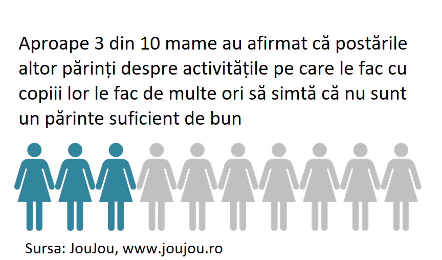Iar sentimentele de neîmplinire își fac apariția și atunci când vine vorba de creșterea copiilor. Aproape 3 din 10 mame au afirmat că postările altor părinți despre activitățile pe care le fac cu copiii lor le fac de multe ori să simtă că nu sunt un părinte suficient de bun. Interesant este că mamele care au afirmat că postările altor părinți le fac de multe ori să simtă că nu sunt un părinte suficient de bun, nu petrec mai puțin timp desfășurând activități cu copiii decât mamele care nu sunt afectate negativ de postările altora.