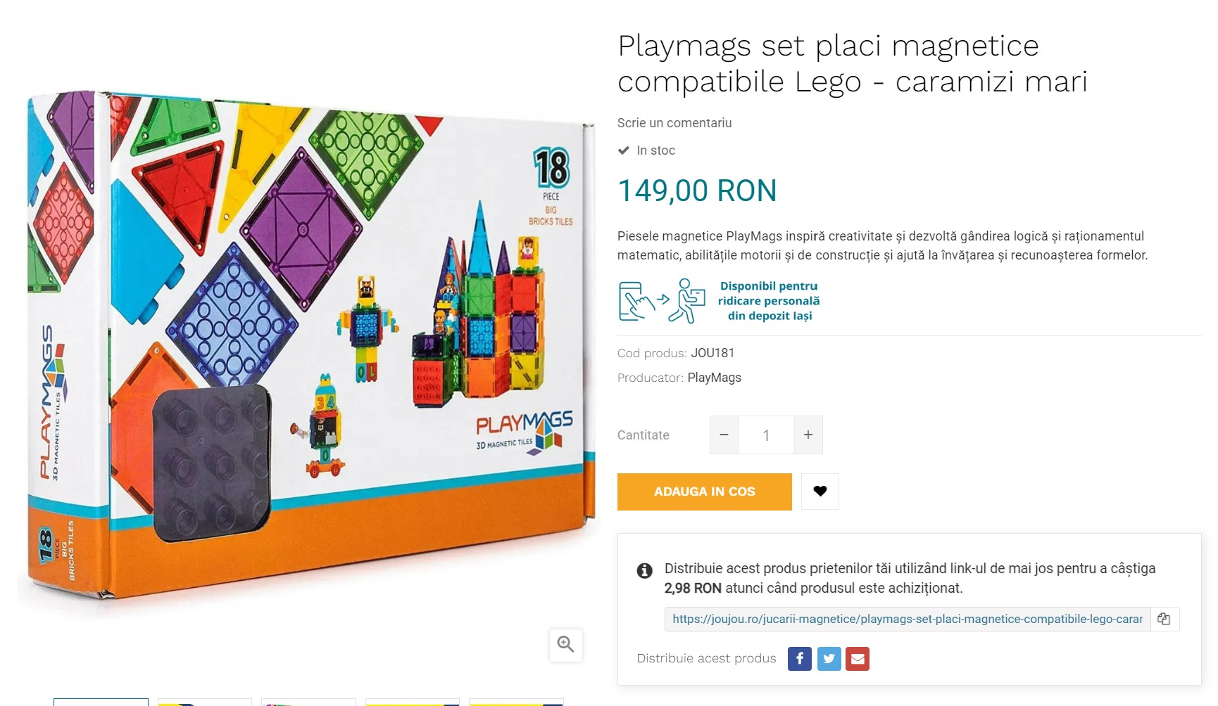 Suma pe care o poți câștiga în contul JouJou atunci când prietenii tăi cumpără un produs recomandat de tine este afișată pe pagina fiecărui produs. De exemplu, pe pagina setul de construcții Playmags ești anunțat că poți câștiga 2,98 lei atunci când un prieten cumpără produsul: “Distribuie acest produs prietenilor tăi utilizând link-ul de mai jos pentru a câștiga 2,98 RON atunci când produsul este achiziționat”.